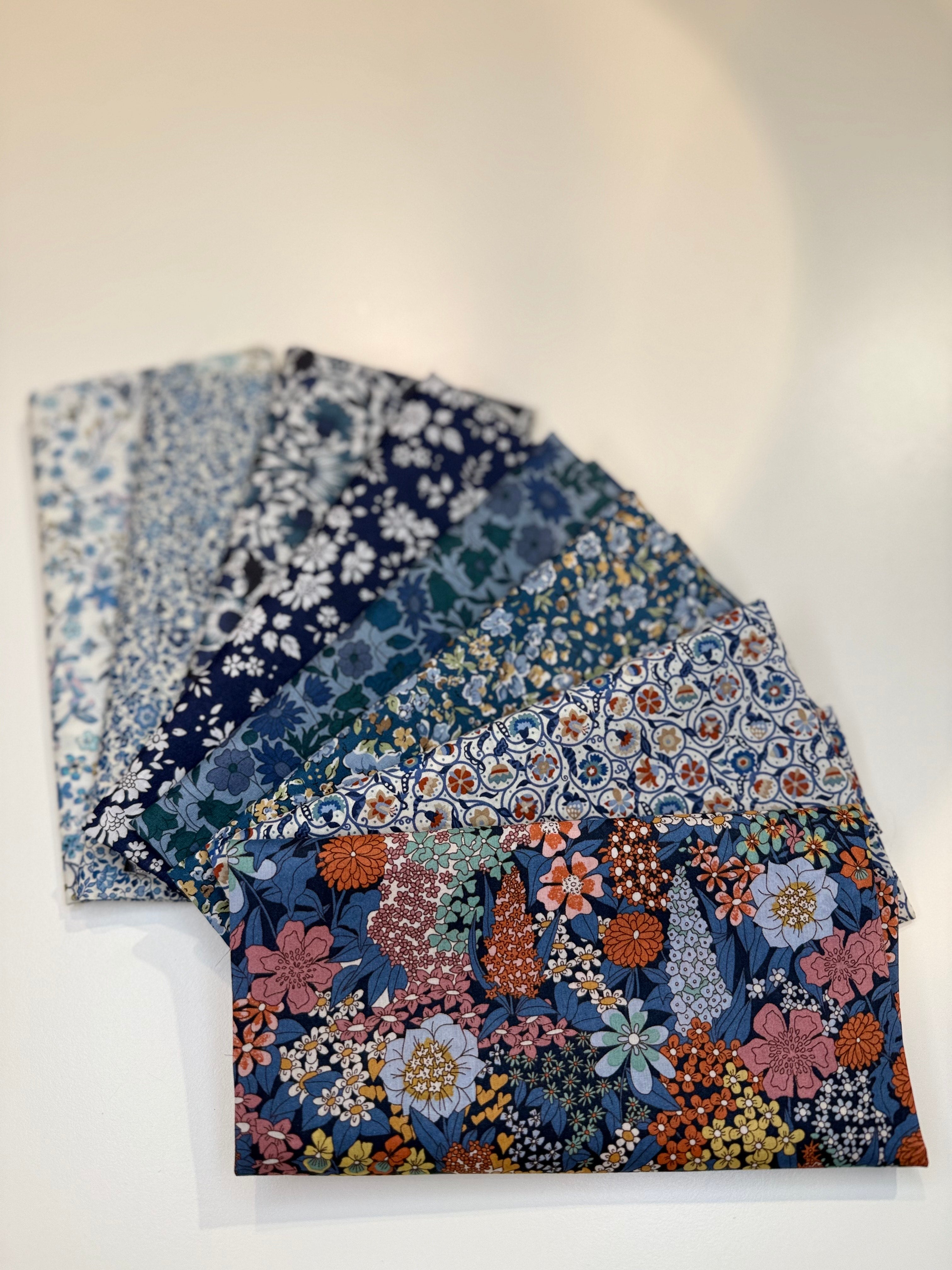 8 forskellige Liberty Tana Lawn® stoffer, der hver er ca. 25 cm x 68 cm